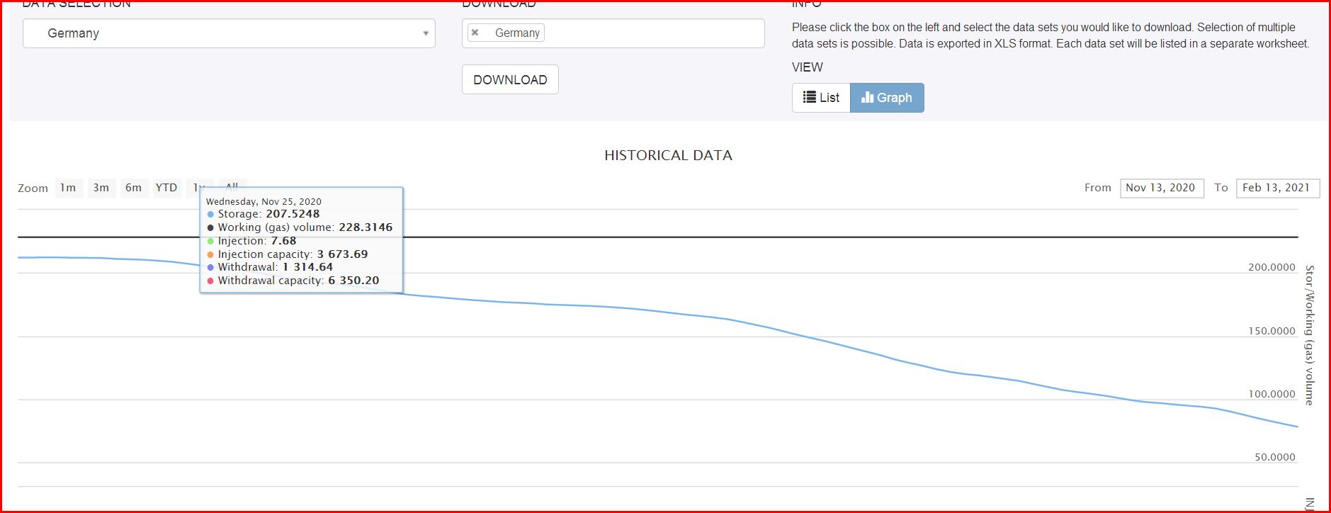 Wenn man auf History klickt, sieht man, daß die Speichermenge rasant abnimmt ... Im Januar waren wir noch bei 50 % Füllstand.