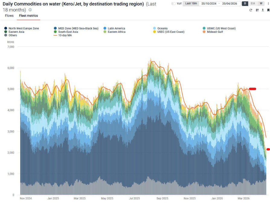Note the dark blue zone, jet/kerosene destined for Europe, is down 80%.