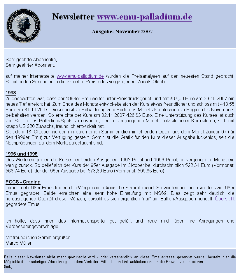 Auch möchte ich eine Linkliste in diese Broschüre aufnehmen, die auf Internetseiten verweist, die sich mit Pd Emus beschäftigen. In diesem Zusammenhang soll auch eine Liste von Münzhändlern entstehen, die Pd Emus anbieten.