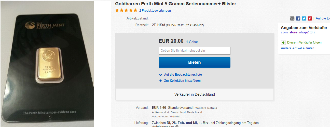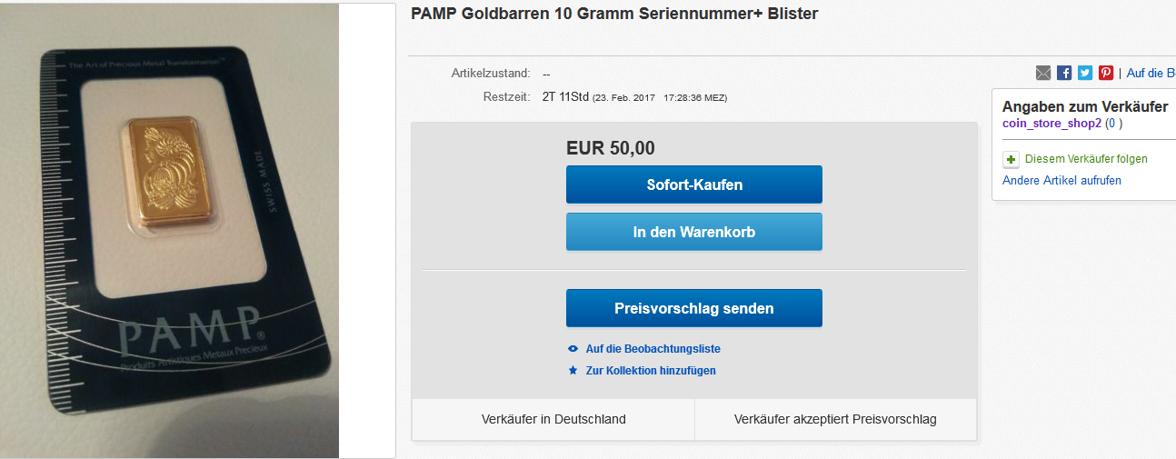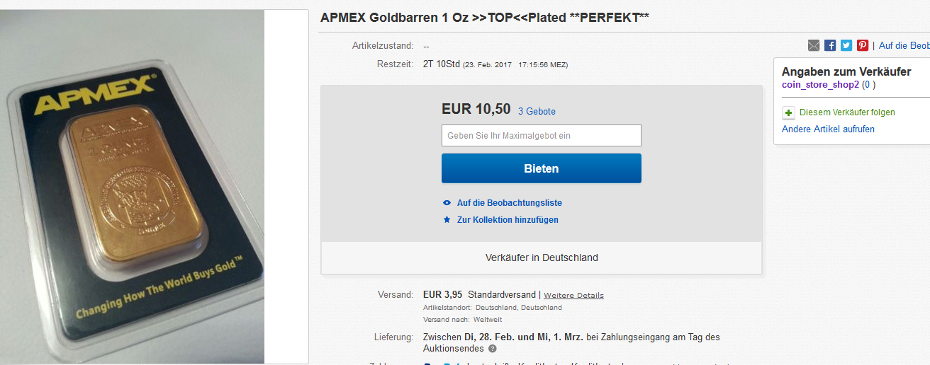 1 ounce Goldbarren für 50€ mit 70 cent Versandkosten und jemand hat sogar ein Gebot abgegeben