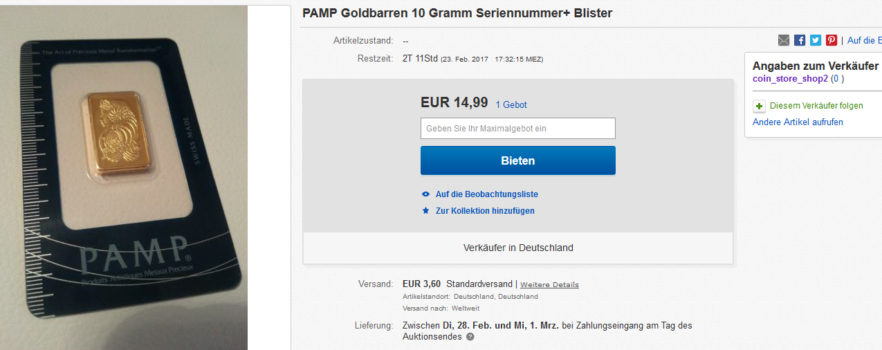 1 ounce Goldbarren für 50€ mit 70 cent Versandkosten und jemand hat sogar ein Gebot abgegeben