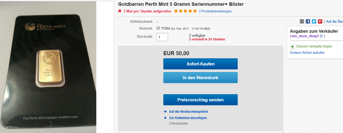 1 ounce Goldbarren für 50€ mit 70 cent Versandkosten und jemand hat sogar ein Gebot abgegeben