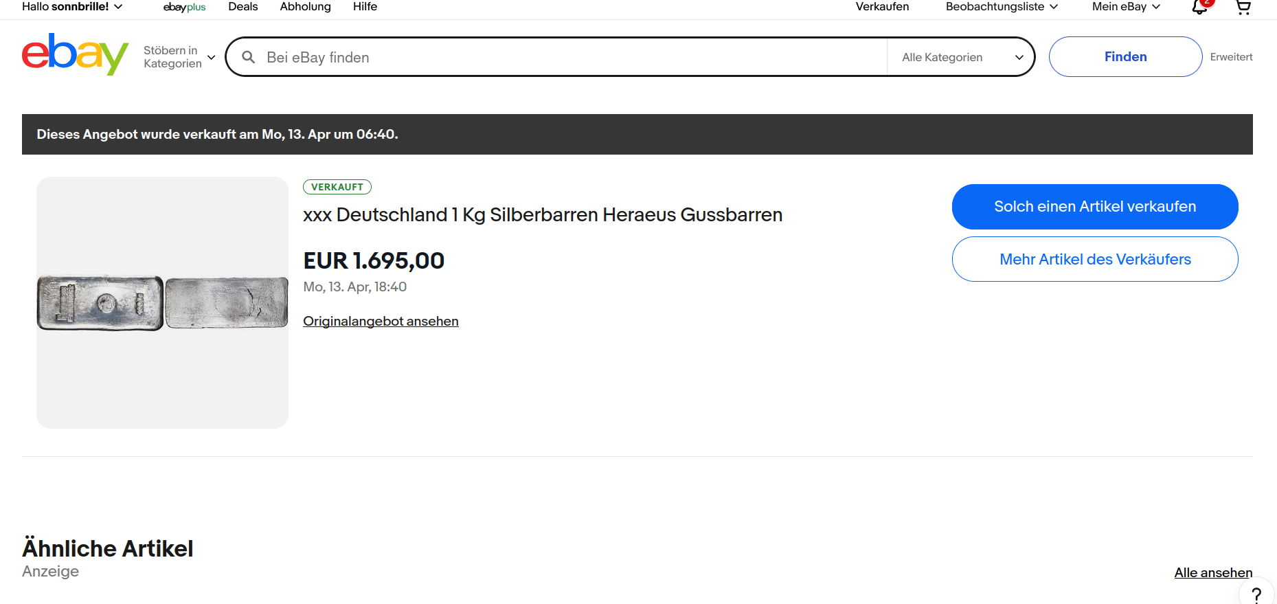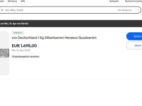 Gewerblicher Händler verkauft 1 kg Barren Silber 1000 EUR unter Wert.
