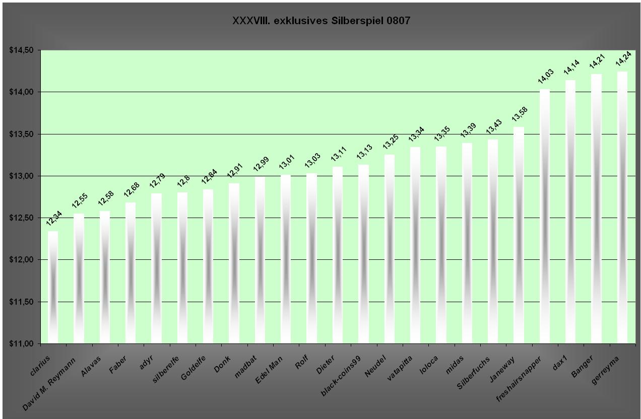 Mir stellt es sich so dar, das clarius 0,32$, David 0,53$ und Alavas 0,56$ daneben lagen. Ich lag mit 0,66 $ deutlich mehr daneben. Für einen 3. Platz für mich hätte der Kurs zwischen 12,51 und 12,76 (mit clarius bzw. Goldelfe geteilt) oder 12,52 - 12,75 (nicht geteilt) liegen müssen.