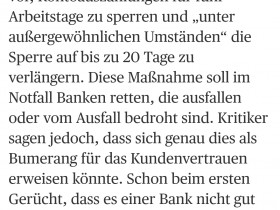 Das dürfte auch funktionieren solange es nur einzelne Banken betrifft aber wehe dem alle oder viele wollen gleichzeitig an ihre Ersparnis?!Dann war es das....