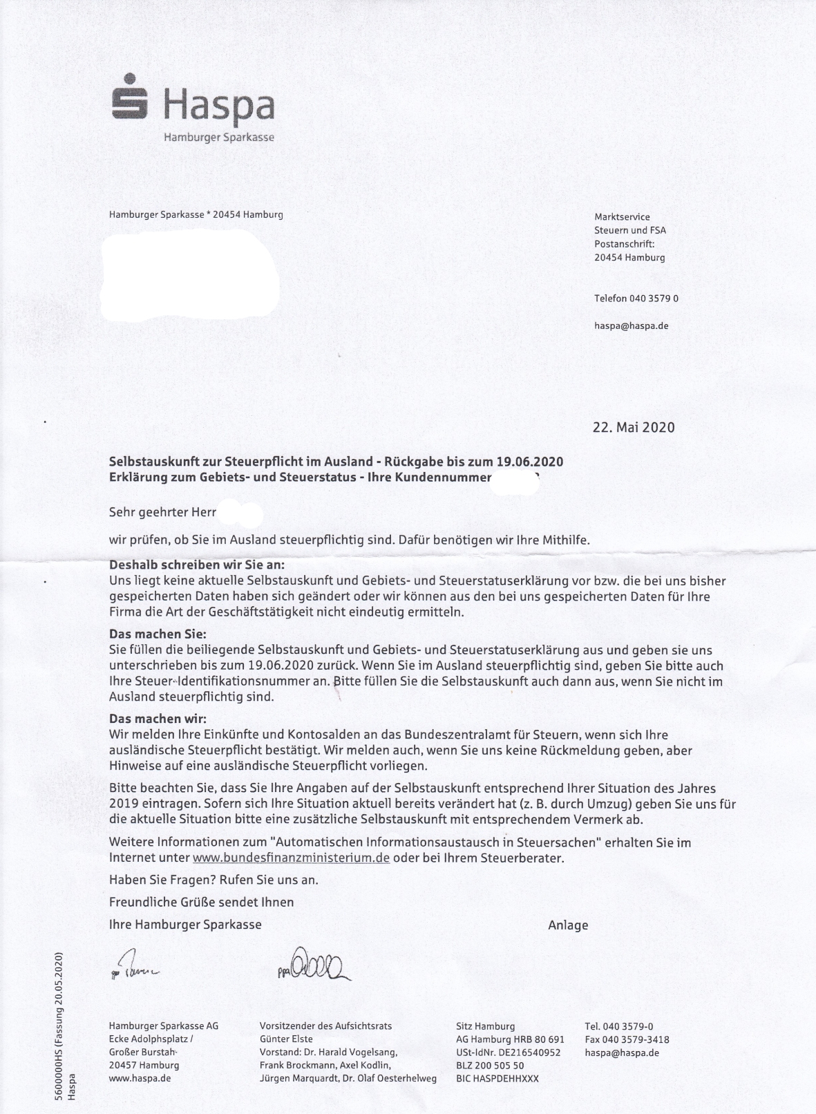 • Dazu kann ich auch ein Schreiben der HASPA beisteuern...