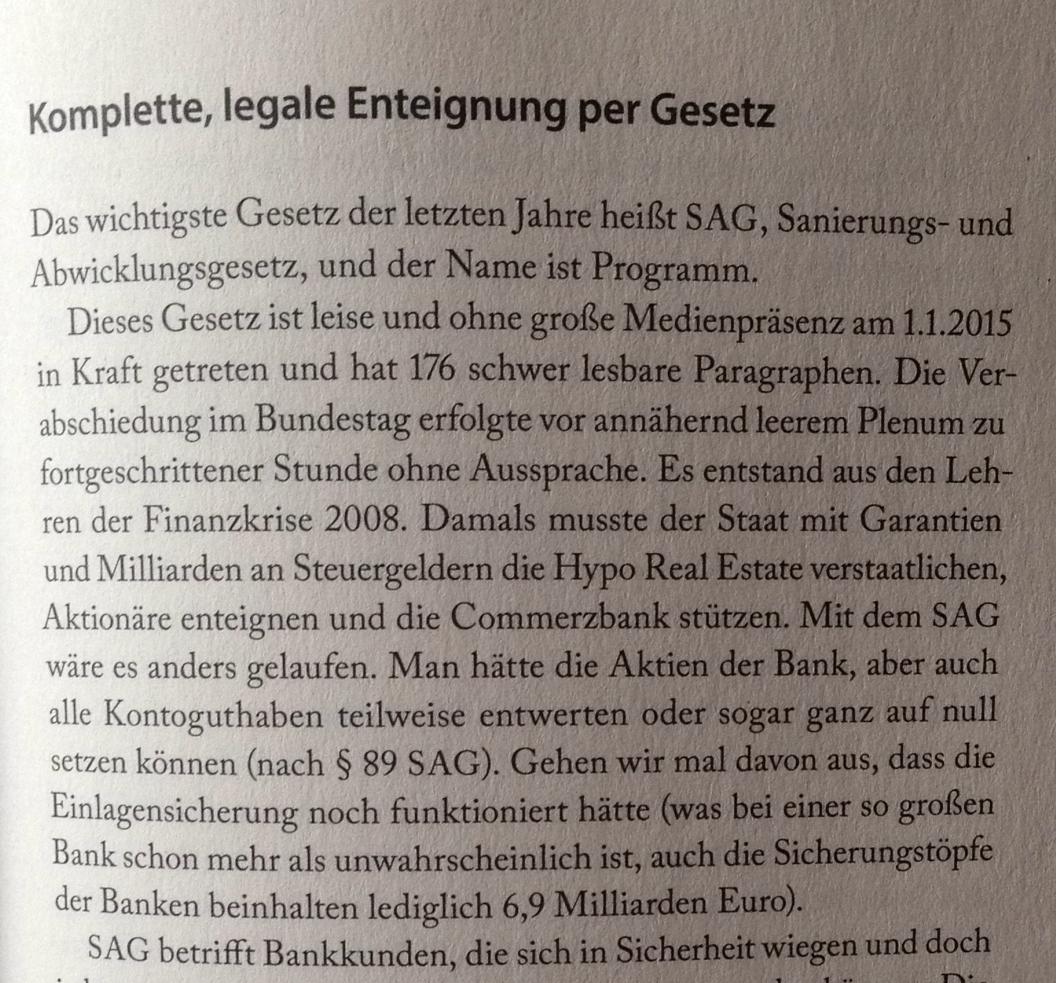 Sanierungs- und Abwicklungsgesetz (SAG) ist wie RHS keine Ossipsrache [bin schon >50 % meiner Zeit im GOldenen Westen^^] und für das GSF ne echte Bildungslücke...darauf wird jeder Depp bei Kontoeröffnung drauf hingeweisen, wurde von Marc Friedrich auch in seinem letzten Buch thematisiert, genauso wie das Gesetz dass den Vers. "erlaubt" im "Notfall" halt mal nicht zu zahlen...
