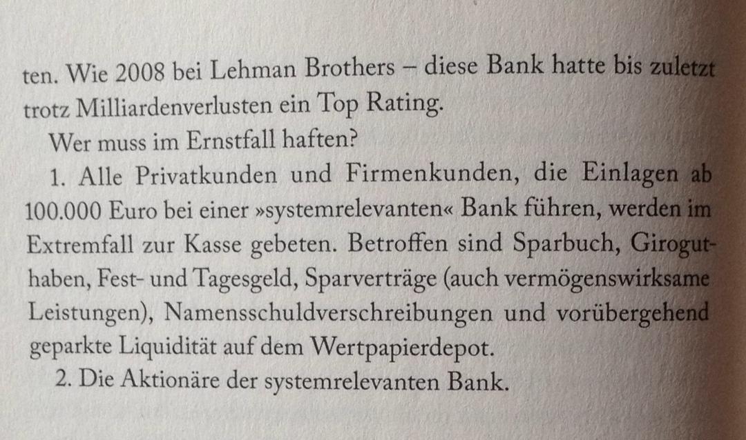 Sanierungs- und Abwicklungsgesetz (SAG) ist wie RHS keine Ossipsrache [bin schon >50 % meiner Zeit im GOldenen Westen^^] und für das GSF ne echte Bildungslücke...darauf wird jeder Depp bei Kontoeröffnung drauf hingeweisen, wurde von Marc Friedrich auch in seinem letzten Buch thematisiert, genauso wie das Gesetz dass den Vers. "erlaubt" im "Notfall" halt mal nicht zu zahlen...