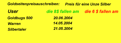 gute Idee. Ich glaube, dass die 8 Dollar-Schwelle bei Silber am 21.5.2004 geknackt wird.