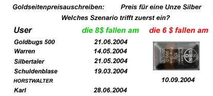 gute Idee. Ich glaube, dass die 8 Dollar-Schwelle bei Silber am 21.5.2004 geknackt wird.