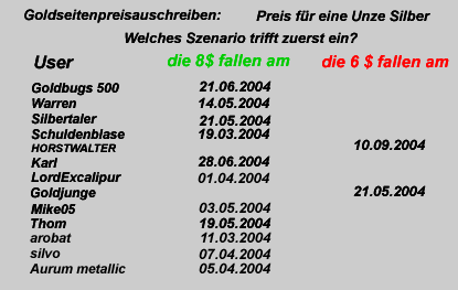 Ich denke Silber kommt nicht vor den Ferien an die 8. Wird aber auch nicht vor den Wahlen auf die 6 runtergehen. Der Silberpreis wird 6-9 Monate seitwärts tendieren und immer wieder bei 7,58 nach unten abprallen. Bis vor den Wahlen wird es um 7 pendeln oder darunter, um dann stetig nach der Wahl nach oben zu gehen. Ich tippe ca. am Dienstag 09.11.04 oder den Freitag 12.11.04, vielleicht auch die Woche danach der Dienstag am 16.11.04 oder Freitag den 19.11.04. Das defintiv zu entscheiden fällt schwer, aber es handelt sich ja um ein Glücksspiel. Da habe ich sowieso nie Glück.