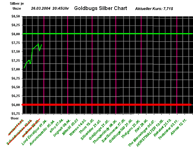 Normalerweise geben uns die Charts Anhalts punkte wie die Kurse sich bewegen. Doch in unserem speziellen Silberfall wird das alles keine rolle spielen! Wir befinden uns in einer grandiosen Aufwärtsbewegung, die bis jetzt noch gemächlich verläuft. Ein Ende ist erst abzu sehen, wenns mal richtig hektisch wird, doch davon sind wir noch einige Euro entfernt! Ich glaube einfach nicht daran, das wir schnell wieder unter die 7 fallen, was einige sich gerne wünschen um nach zu kaufen!