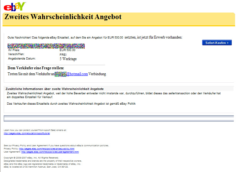 In den letzten Tagen ist es wieder häufiger vorgekommen, dass gefälschte e-Mails versand werden, die den Anschein erwecken, dass diese von ebay stammen. Die e-Mails bieten unter anderem an, dass man einen Artikel kaufen könne, bei dem man überboten wurde. Um den Kauf abzuwickeln sollte man sich an eine e-Mail Adresse melden.