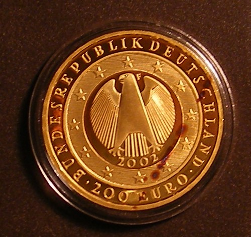 ich musste gerade feststellen, dass meine 200 EUR Goldmünze zur Euro-Einführung blau - violette Flecken auf der Rückseite bekommen hat..