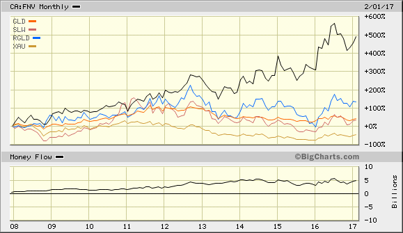Aus meiner Sicht sind Royalties ideale Langfrist Investments, eigene Erfahrung über ein Jahrzehnt hinaus mit FNV, zuvor FN, spricht dafür: Sie haben auch eine Vola mit den Märkten, aber langfristig stetige Entwicklung, das triftt insbes. auf FNV zu., sh. Chartvergleich.