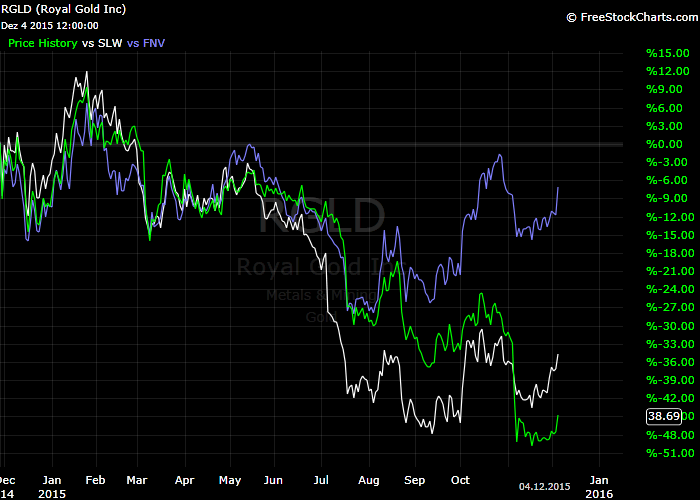 Chart: Vergleich seit meinen Käufen von SLW und RGLD im Dezember 2015. Nicht unerwartet RGLD besser als FNV. SLW mit mehrheitlich Silberroyalties und -streams natürlich etwas aggressiver mit mehr Vola.