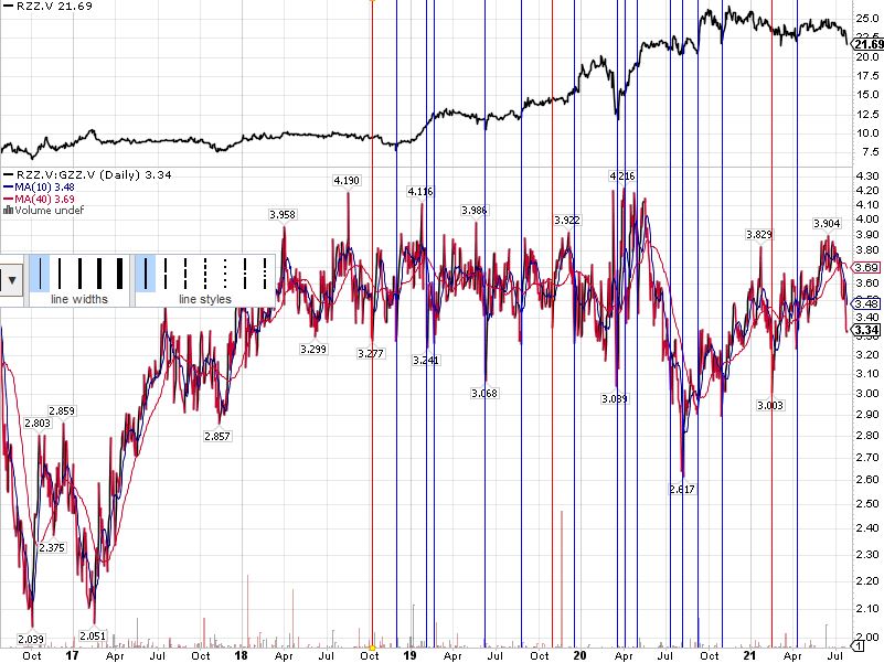 Hier mal gezeigt, wie häufig solche Ausreißer im Ratio RZZ:GZZ in den letzten Jahren einem Kursanstieg von RZZ voran gingen (blau) und wie oft nicht (rot).