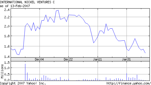 • Seit der obigen Vorstellung von International Nickel Venture (INV.TO) im November 06 ist der Kurs nun deutlich zurückgekommen - heute allerdings +8% -. Noch sehe ich keine Bodenbildung, die ich als Einstiegssignal für mich deuten könnte.