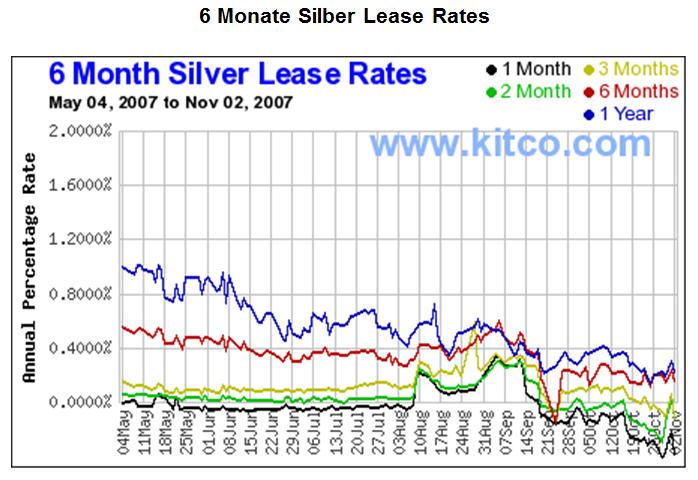 Grundsätzlich gilt bei den „lease rates“ (Leihzinsen), wie auch bei allen anderen Märkten auch, das Prinzip von Angebot und Nachfrage. Ist ein Markt, z.B. der Silbermarkt mit physischer Ware überversorgt, so sind die Leihzinsen prinzipiell niedrig, bei einem Unterangebot gilt das Umgekehrte. Doch das kann man nicht pauschalisieren – denn selbst wenn am Spotmarkt ein Überangebot herrscht, können die Leihzinsen hoch sein. Wie kommt das? Die Höhe der "lease rates" hat im Prinzip nichts mit dem Spotmarkt zu tun. Es kommt hier vielmehr darauf an, wie viel an Gold bzw. Silber zur Verleihung zur Verfügung steht. Wobei wir wieder beim Prinzip von Angebot und Nachfrage wären – die "lease rates" bilden praktisch die Entwicklung eines „eigenen Marktes“ ab. Sie zeigen, wie hoch der Umfang an physischer Ware ist, die zur Verleihung zur Verfügung steht. Dieses „Leihangebot“ kann sowohl von Verkäufen aus Lagerbeständen, als auch in Form von Vorwärtsverkäufen zur Verfügung gestellt werden. Zusammenfassend kann man sagen: Übersteigt die Nachfrage am „Leihmarkt“ das Angebot an physischer Ware, so sind die Leihzinsen hoch – herrscht ein Überangebot, so sind die lease rates niedrig. Die "lease rates" werden für die folgenden Zeiträume ausgewiesen: 1 Monat, 2 Monate, 3 monate, 6 Monate und 12 Monate. Beim Prozentsatz handelt es sich um Jahreszinsen.