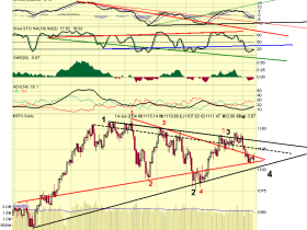 • Der S&P bricht nach Erreichen der roten Spizte stark ein und unterster schenkel konnte nicht mehr halten. RSI & MACD aber soeben auf starke Unterstuetzung gestssen. Ein Anstieg des S&P steht wieder an. Ob er so kraeftig wird, dass er noch die rote Spitze trifft, ist moeglich. Nach dem roten eck muesste jetzt ein Thrust nach unten starten. AUCH das schwarze 3eck wuerde ein Abfallen des Indexes nach unten gutheissen koennen, da Welle 4 bei Erreichen des unteren Schenkels abgeschlossen waere und danach SOFORT die Impulsbewegung beginnen kann. Der Uebergang waere in diesem Beispiel dann fliessend.