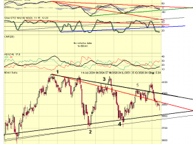 • aehnliches Bild fuer den S&P, wobei hier interessant erscheint, dass noch eine 4. Welle erfolgen koennte. Beim DOW ist dies nicht ersichtlich. Der S&P eignet sich manchmal besser fuer Chartanalysen um eine allgemeine Richtung vorzugeben, da im S&P nicht soviel noise und spekulanten drin sind, die kursbewegungen verzerren koennen. Die naechsten Tage duerften Aufschluss geben, ob erstmals ein weiteres Einsacken des S&Ps erfolgt (und somit die 4.Welle erst noch einsetzt) und den DOW&Co in eine aehnliche Bewegung mitnimmt, was bedeuten wuerde, dass der DOW eine weitere Welle benoetigt und dieses mal nicht nach idealer Vorgehensweise innerhalb eines 3ecks bewegt. Nicht ideal hat aber nicht zu bedeuten, dass das 3eck fuer eine potentielle Impulsbewegung nach oben nicht mehr geeignet ist!
