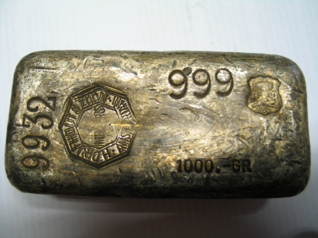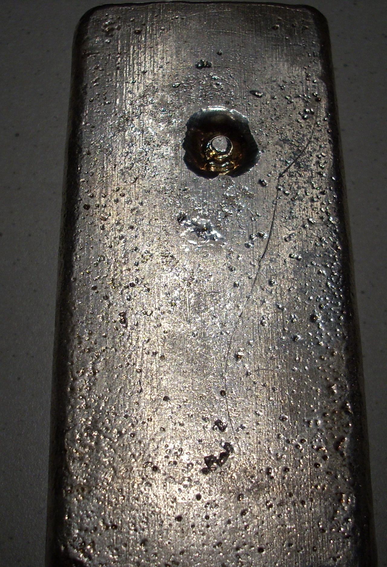 Ich habe hier (glaube ich) etwas besonderes. Auf der Rückseite des silberbarrens befindet sich eine runde Vertiefung ca. 20 mm mit eine goldglänzendem Einschluß. Sieht wunderschön aus.
