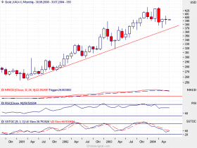 Umfassender Warnhinweis: Unsere Warnung bzgl. GOLD müssen wir an dieser Stelle erneut unterstreichen. Das Kursgeschehen seit dem 05.05.2004 zeigt einen mustergültigen bearishen Keil. Innerhalb dessen steigt GOLD an... Die Keilunterkante verläuft derzeit bei ca. 390 $. Fällt der Goldpreis unter 390 $, löst dies ein saftiges Verkaufssignal bis zunächst 371 $ aus. Bei 371 $ wird sich dann zeigen, ob GOLD einer finalen bearishen Auflösung des Keils entgehen und einen großen Doppelboden ausbilden kann. Ein Bruch der 370 $ Marke würde ein massives charttechnisches Verkaufssignal bis 361 $, 340 $ und im Extrem bis 328 $ einleiten. Wir wechseln mit einem Schlag ohne mit der Wimper in das Lager der kurzfristigen Goldbullen, wenn GOLD über 407,7 $ ansteigen kann. Zum einen würde GOLD einen ganz maßgeblichen Retracementwiderstand brechen, zum anderen würde GOLD dann regelwidrig aus dem Bearkeil nach oben ausbrechen. Das wäre umso bullisher zu werten.
