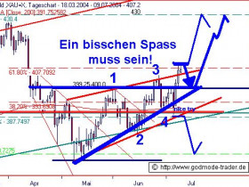 Umfassender Warnhinweis: Unsere Warnung bzgl. GOLD müssen wir an dieser Stelle erneut unterstreichen. Das Kursgeschehen seit dem 05.05.2004 zeigt einen mustergültigen bearishen Keil. Innerhalb dessen steigt GOLD an... Die Keilunterkante verläuft derzeit bei ca. 390 $. Fällt der Goldpreis unter 390 $, löst dies ein saftiges Verkaufssignal bis zunächst 371 $ aus. Bei 371 $ wird sich dann zeigen, ob GOLD einer finalen bearishen Auflösung des Keils entgehen und einen großen Doppelboden ausbilden kann. Ein Bruch der 370 $ Marke würde ein massives charttechnisches Verkaufssignal bis 361 $, 340 $ und im Extrem bis 328 $ einleiten. Wir wechseln mit einem Schlag ohne mit der Wimper in das Lager der kurzfristigen Goldbullen, wenn GOLD über 407,7 $ ansteigen kann. Zum einen würde GOLD einen ganz maßgeblichen Retracementwiderstand brechen, zum anderen würde GOLD dann regelwidrig aus dem Bearkeil nach oben ausbrechen. Das wäre umso bullisher zu werten.