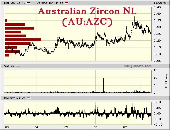 ZitatAustralian Zircon NL is a publicly company listed on the Australian Stock Exchange Limited ASX Code: AZC. The Company's prime asset is the 100 percent owned and managed Mindarie Project, principally a zircon mine which will also produce ilmenite, rutile and leucoxene. The Company's total 15,326 km2 with approximately 60% of Project revenue derived from zircon sales. The Project is located 148km east of Adelaide, South Australia. Risk equity capital invested in the project to date totals approximately $19 million.