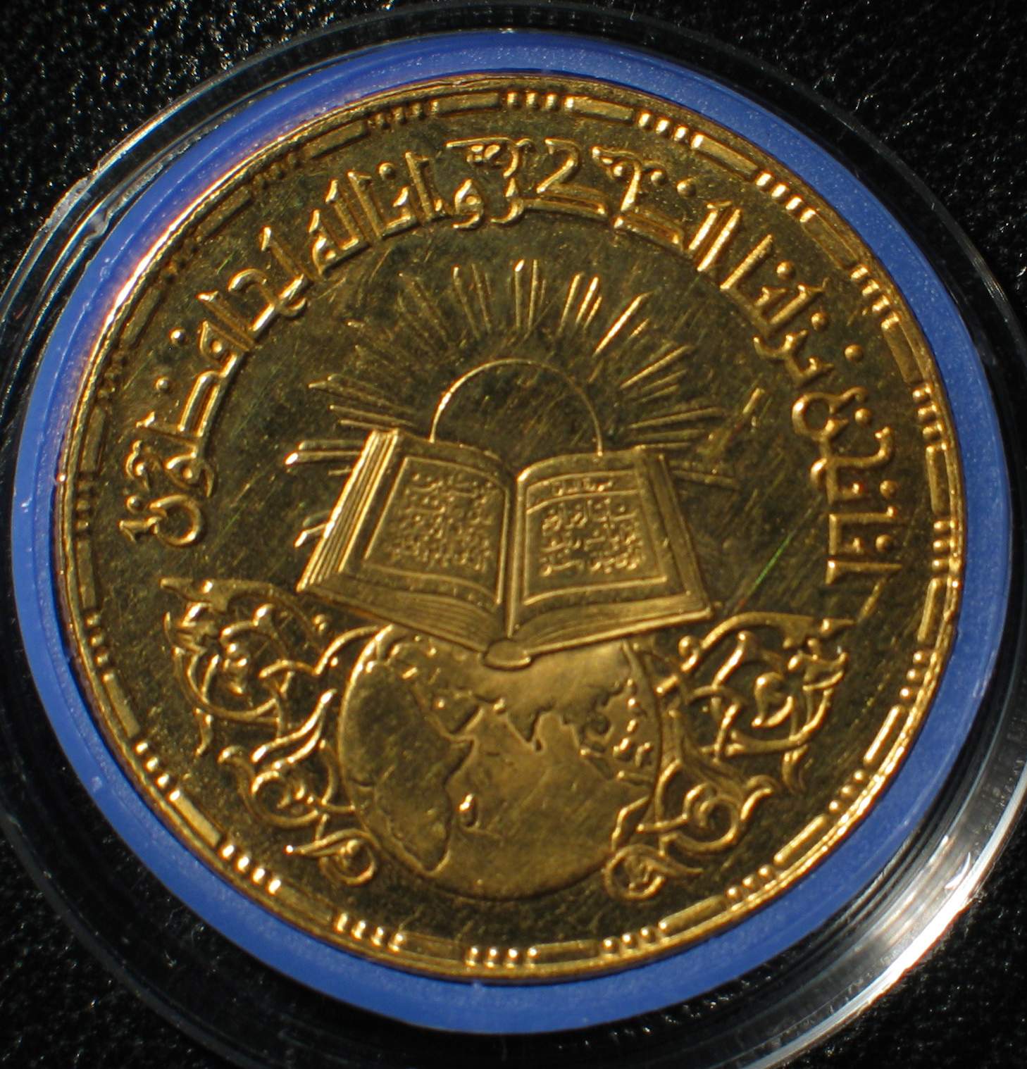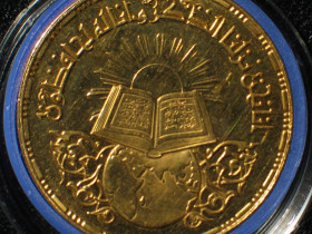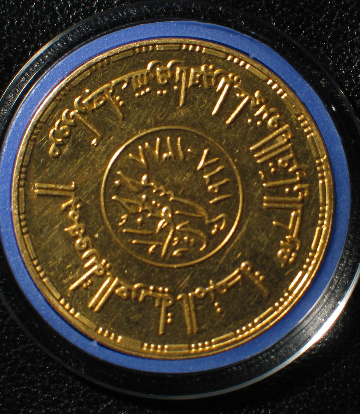 Übrigens: die Münze sieht aus wie hochlegiertes Gold, ich würde tippen 917 wie üblich in den arabischen Ländern, Gewicht ca. 25,9 g, Durchmesser 32 mm