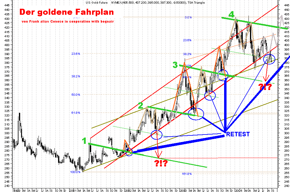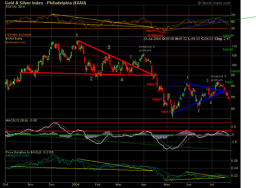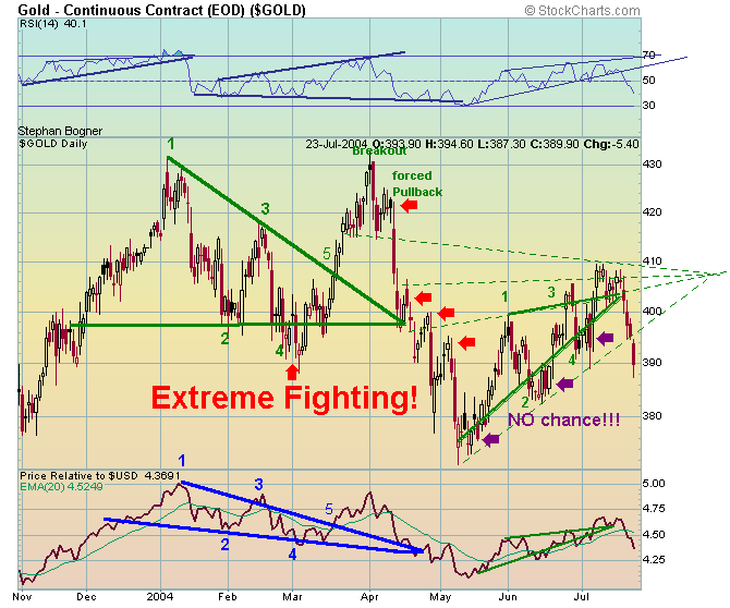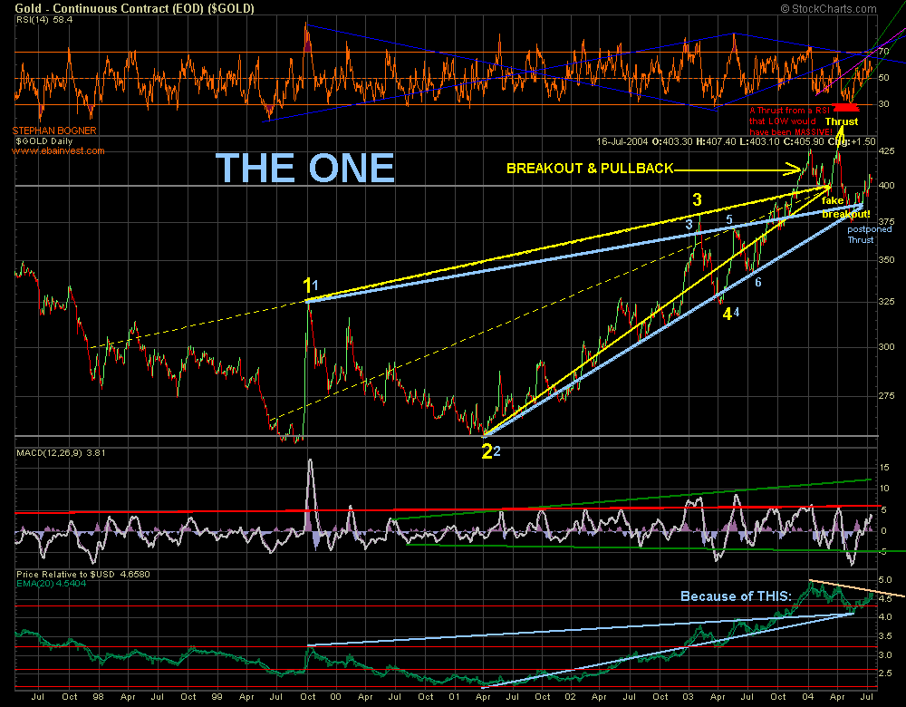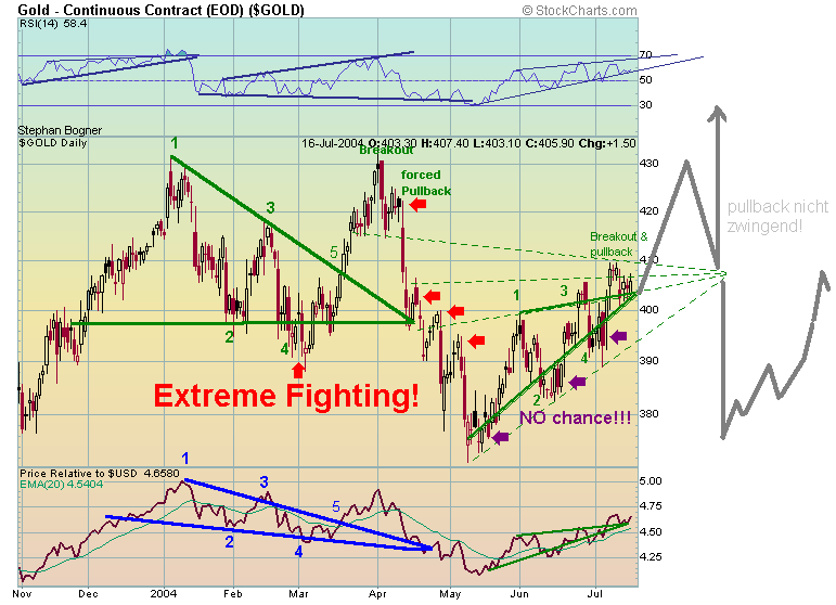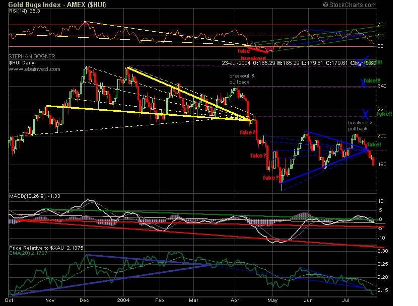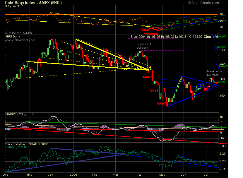 Nach einem erfolgreichem Breakout und anschliessendem *gesunden* Pullback zurueck zur Spitze Anfang MAI 2004, befand sich der RSI auf einem *gesunden* Level von 30 und ein anschliesssender Thrust nach oben haette den HUI mE weit ueber 275 gehievt bis der RSI wieder oben bei den 70ern angelangt waere. Der RSI war damals schon am Boden, und der naechste Aufwaertszyklus unaufhaltsam, doch der HUI crashte an 3 Tagen besonders stark ein, und der RSI ging gezwungenermassen kurzzeitig unter die 30er Marke, um von diesem tiefstmoeglichen (!) Boden zu steigen. Obwohl der RSI nur minimal einsackte, krachte der HUI stark von 210 auf 160 Punkte ein. Da der HUI sowieso am steigen gewesen waere mitsamt dem RSI, half dieser kuenstlich ausgeuebter Crash, die unaufhaltsame Aufwaertsbewegung (zyklus) VON EINEM ANDEREN *tieferen* NIVEAU starten zu lassen! Kurs und Preismanipulation ist mE zeitlich nicht willkuerlich, sondern gezielt zu gewissen Zeiten. Ziel ist den unaufhaltsamen Aufwaertstrend somit nicht nur zu verlangsamen, sondern vielmehr auf einem relativen Niveau zu halten, sprich vermeiden, dass gewisse Aufwaertszyklen nicht von einem hohen Preisniveau starten, sondern lieber von einem niedrigeren, damit der HUI zB nicht von 210 auf mind. 250 steigt, sondern waehrend dem Aufwaertszyklus von 160 auf 200. Wenn dieser jetzige Aufwaertstrend kurz durchschnauft (RSI ueber 70 und sackt ein) dann befindet sich der HUI eben nicht auf einem Kursniveau von mind. 250-300, sondern eben *nur* auf 210-250. Auf Jahre gerechnet macht dies enorm was aus, der HUI waere mE ohne schwarzmaechtige Preiseinfluesse seit 1999 auf einem vielfach hoeherem Niveau wie heute. Nicht umsonst reden Goldexperten die ganze Zeit darueber, dass der Goldpreis heute schon bei mind. 600 USD stehen muesste...