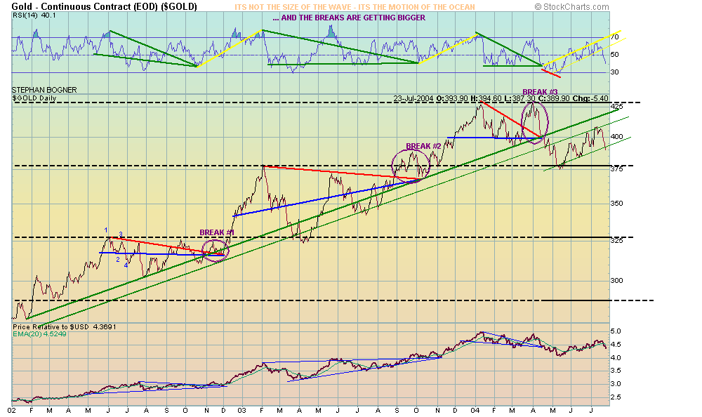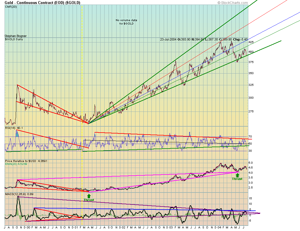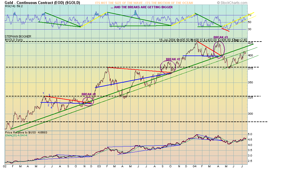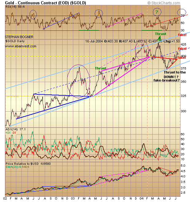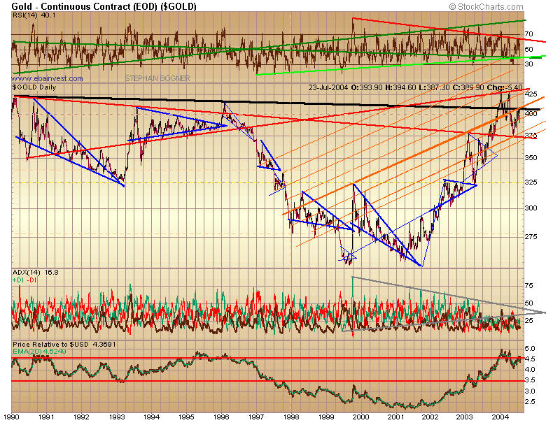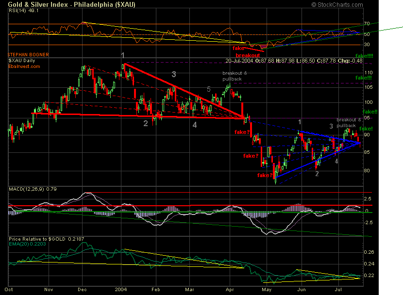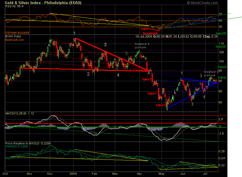 Nach einem erfolgreichem Breakout und anschliessendem *gesunden* Pullback zurueck zur Spitze Anfang MAI 2004, befand sich der RSI auf einem *gesunden* Level von 30 und ein anschliesssender Thrust nach oben haette den HUI mE weit ueber 275 gehievt bis der RSI wieder oben bei den 70ern angelangt waere. Der RSI war damals schon am Boden, und der naechste Aufwaertszyklus unaufhaltsam, doch der HUI crashte an 3 Tagen besonders stark ein, und der RSI ging gezwungenermassen kurzzeitig unter die 30er Marke, um von diesem tiefstmoeglichen (!) Boden zu steigen. Obwohl der RSI nur minimal einsackte, krachte der HUI stark von 210 auf 160 Punkte ein. Da der HUI sowieso am steigen gewesen waere mitsamt dem RSI, half dieser kuenstlich ausgeuebter Crash, die unaufhaltsame Aufwaertsbewegung (zyklus) VON EINEM ANDEREN *tieferen* NIVEAU starten zu lassen! Kurs und Preismanipulation ist mE zeitlich nicht willkuerlich, sondern gezielt zu gewissen Zeiten. Ziel ist den unaufhaltsamen Aufwaertstrend somit nicht nur zu verlangsamen, sondern vielmehr auf einem relativen Niveau zu halten, sprich vermeiden, dass gewisse Aufwaertszyklen nicht von einem hohen Preisniveau starten, sondern lieber von einem niedrigeren, damit der HUI zB nicht von 210 auf mind. 250 steigt, sondern waehrend dem Aufwaertszyklus von 160 auf 200. Wenn dieser jetzige Aufwaertstrend kurz durchschnauft (RSI ueber 70 und sackt ein) dann befindet sich der HUI eben nicht auf einem Kursniveau von mind. 250-300, sondern eben *nur* auf 210-250. Auf Jahre gerechnet macht dies enorm was aus, der HUI waere mE ohne schwarzmaechtige Preiseinfluesse seit 1999 auf einem vielfach hoeherem Niveau wie heute. Nicht umsonst reden Goldexperten die ganze Zeit darueber, dass der Goldpreis heute schon bei mind. 600 USD stehen muesste...
