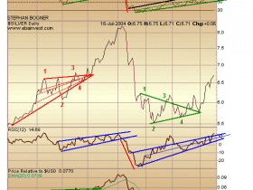 Seit Ende April 04 war diese Linie stark widerstaendig und Silber musste ein 3eck bilden, um diese Zone zu durchbrehcen. Der Ausbruch gelang mit 5.Welle, der Breakout markierte diesen als signifikanten Widerstand, startete einen Pullback zurueck zur Spitze um danach diese markante Marke eindrucksvoll zu durchbrechen. Bei 6.71 prallte Silber erstmal ab, da dies ebenfalls einen bedeutenden Widerstand markiert, welcher mit dem roten Dreiecksspitze inhergeht.