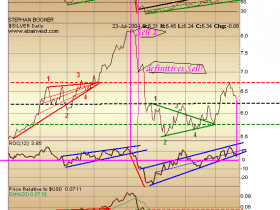 Somit: Eigentlich muesste der ROC bei Silber jetzt unter die 0 nach ganz unten abfallen, um dann wieder steigen zu koennen. Allerdings sieht man erst in Verbindung mit dem Silberpreis, dass dieser bei 6,23 eine starke Unterstuetzung aufgebaut hat. Somit duerfte der ROC genau auf der 0 halten, wenn Silber bei 6,23 angelangt ist. Faellt der ROC dann zuerst(!!!) unter diese Linie, dann wird(!) der Silberpreis kurz spaeter auch einbrechen, ... in Richtung gruene Unterstuetzung bei $5,81.