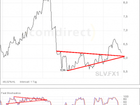 Fazit: Silberpreis ist zwischen langjährigen (roten) Aufwärtstrendlinie und der (braunen) oberen Dreiecksbegrenzung eingekeilt. Es wird interessant wohin der Ausbruch stattfindet.