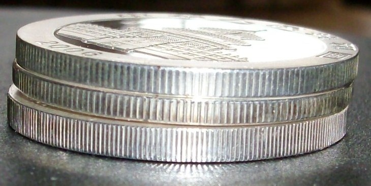 Nach Betrachtung der etws kleinen Bilder, deshalb mit Vorbehalt, gebe ich mal Entwarnung. Der 2005er ist auf beiden Seiten auch ohne Wägung als fake zu erkennen die "1" von "1 oz" ist nicht nah genau am Bild und die "2" von "2005" sieht im Original auch anders aus. Beim 2003er fehlt der Teppich auf den Stufen komplett. Die "6" von "2006" hat gar nichts mit dem Original zu tun.