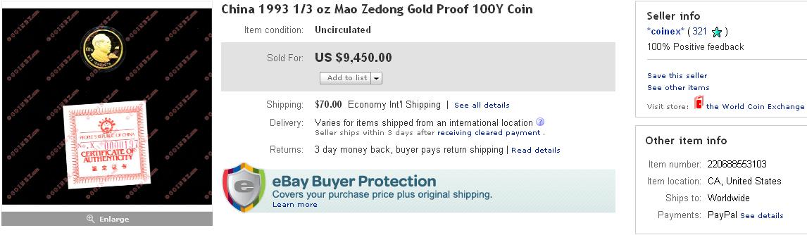 • Da stellt diese Münze die Münze vom Jahr des Friedens in den Schatten. Nach 5 Monaten Richtwert heute Ende Oktober 45.000-50.000 RMB. Geplante Auflage 25.000, tatsächliche Auflage um die 4.503 bzw. unbekannt. Sicherlich haben die Mao-Anhänger und KPCh Funktionäre diese Münze gehortet und neben dem Familienschrein aufgestellt. :D
