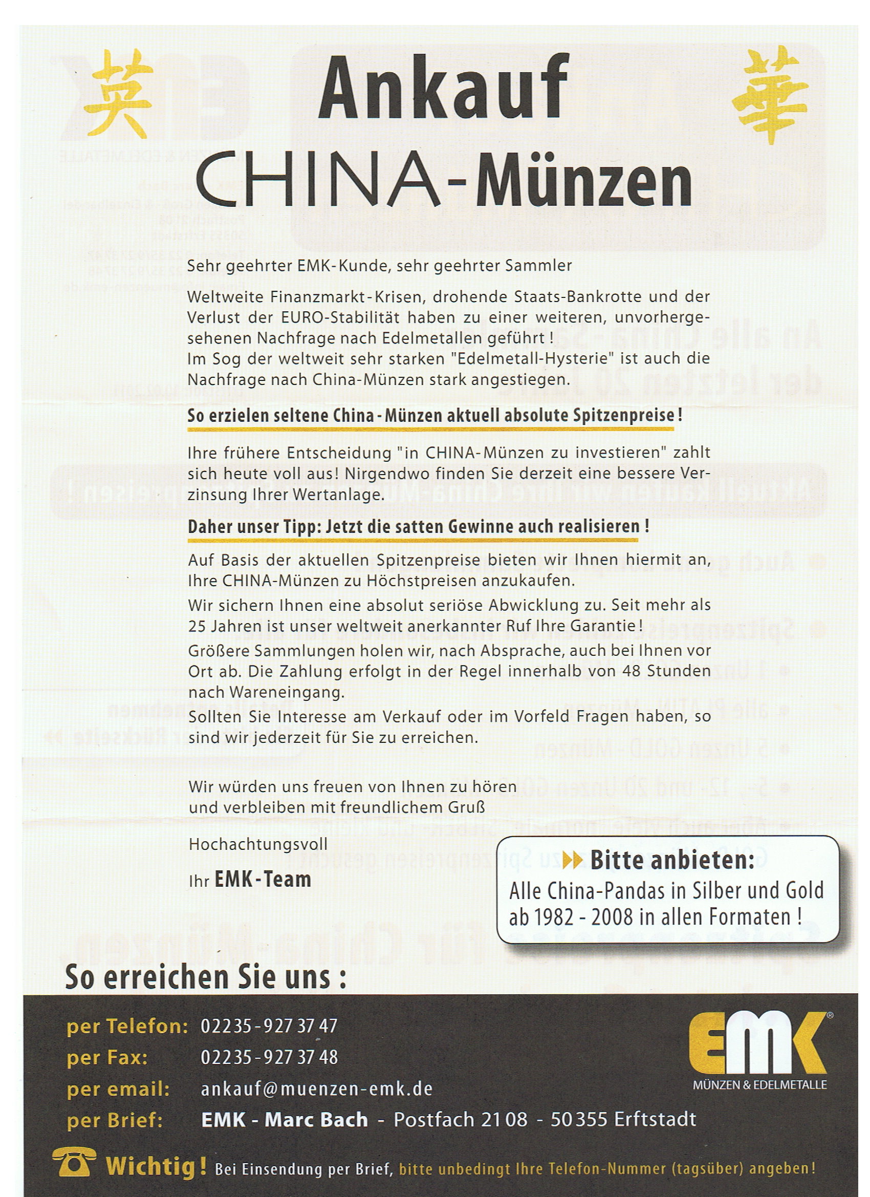 Wer in der heutigen Zeit des Internets keine halbwegs aktuelle HP auf die Beine stellt ist völlig fehl am Platz und wer dann solche "Ankaufswische" verschickt schon lange. Da fehlt nur noch ein kleiner Schritt und "Briefgold" läßt grüßen. Unter dem Motto "Sie haben Chinamünzen die Sie nicht mehr brauchen....bla,bla,bla