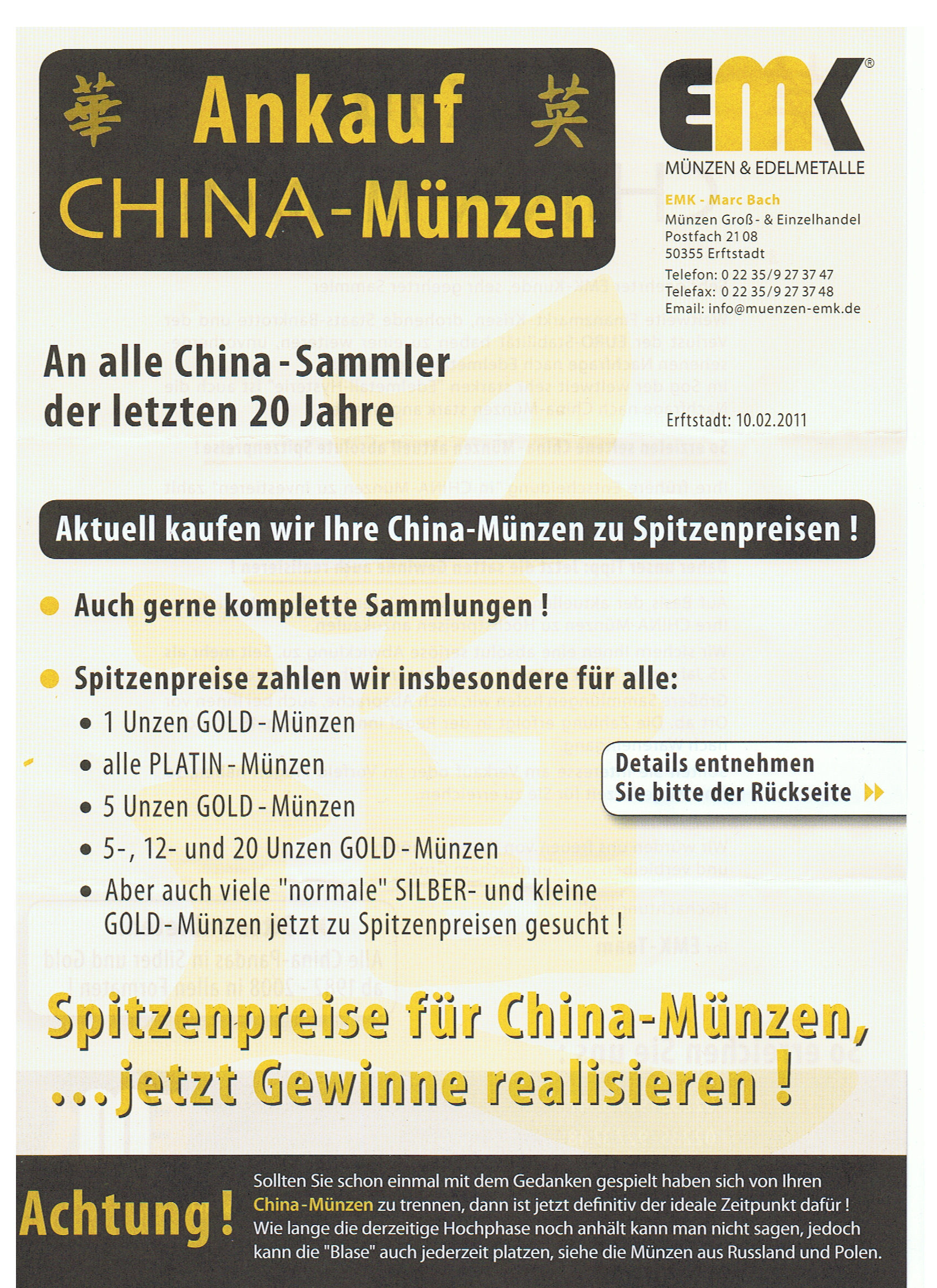 Wer in der heutigen Zeit des Internets keine halbwegs aktuelle HP auf die Beine stellt ist völlig fehl am Platz und wer dann solche "Ankaufswische" verschickt schon lange. Da fehlt nur noch ein kleiner Schritt und "Briefgold" läßt grüßen. Unter dem Motto "Sie haben Chinamünzen die Sie nicht mehr brauchen....bla,bla,bla