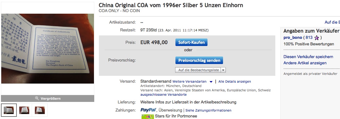 Die Preise werden verrückt. Diese Auktion (COA für Einhorn 1996) übertrifft ja noch den Preis für ein COA zur 2 Unzen Gold Drache & Phönix