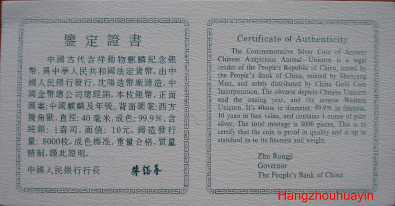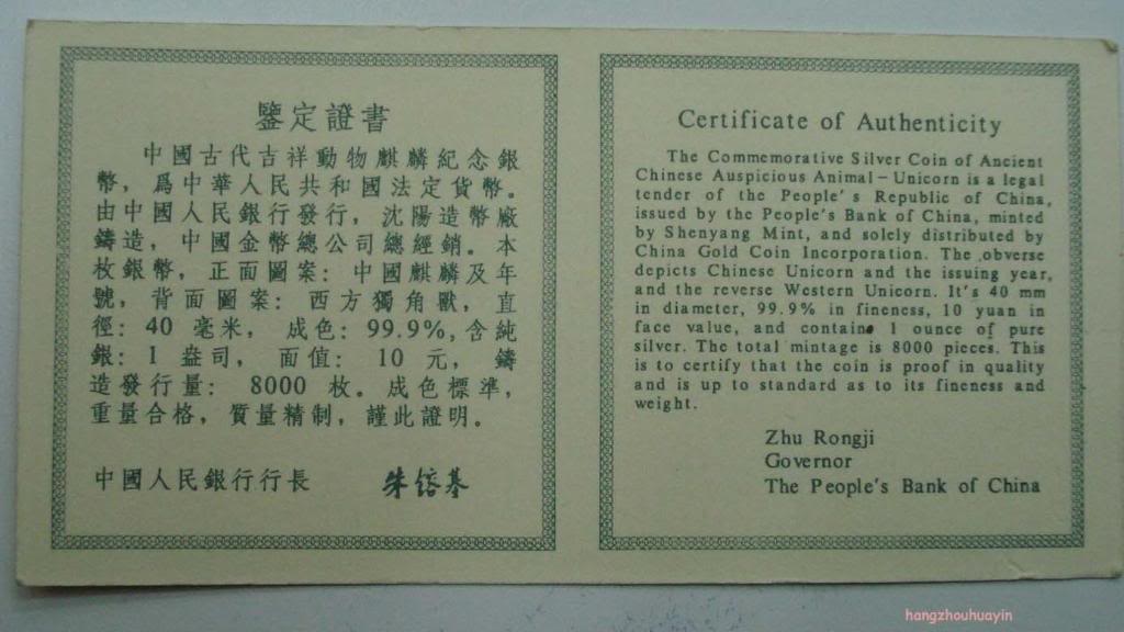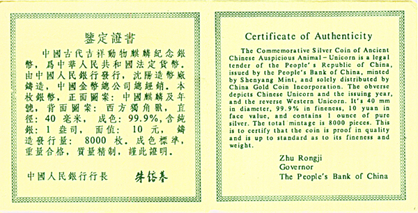 Unicorn 1995 10 Yuan PP Silber Fälschung? Das Zertifikat mit der eckigen Umrahmung ist das richtige Original, das Deckt sich auch mit diversen Gold Unicorn Zertifikaten aus 1995.