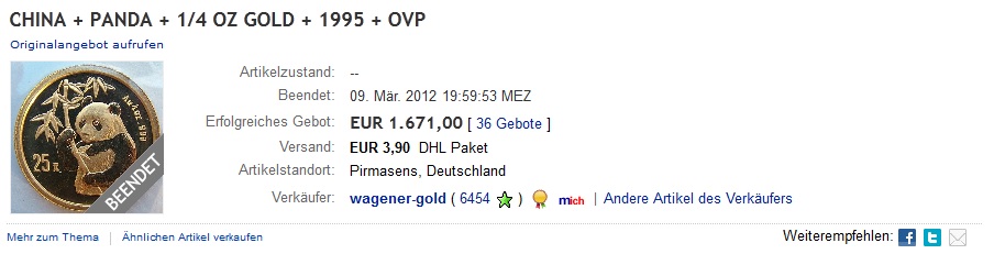 wiso...? der Preis ist doch noch OK, auch wenn diese Münze schon mal mehr brachte gab es die vor 4 Jahren noch für 400 € , sorge machen die Hasen, diese 100 yuan Gold Münzen machen doch freude.