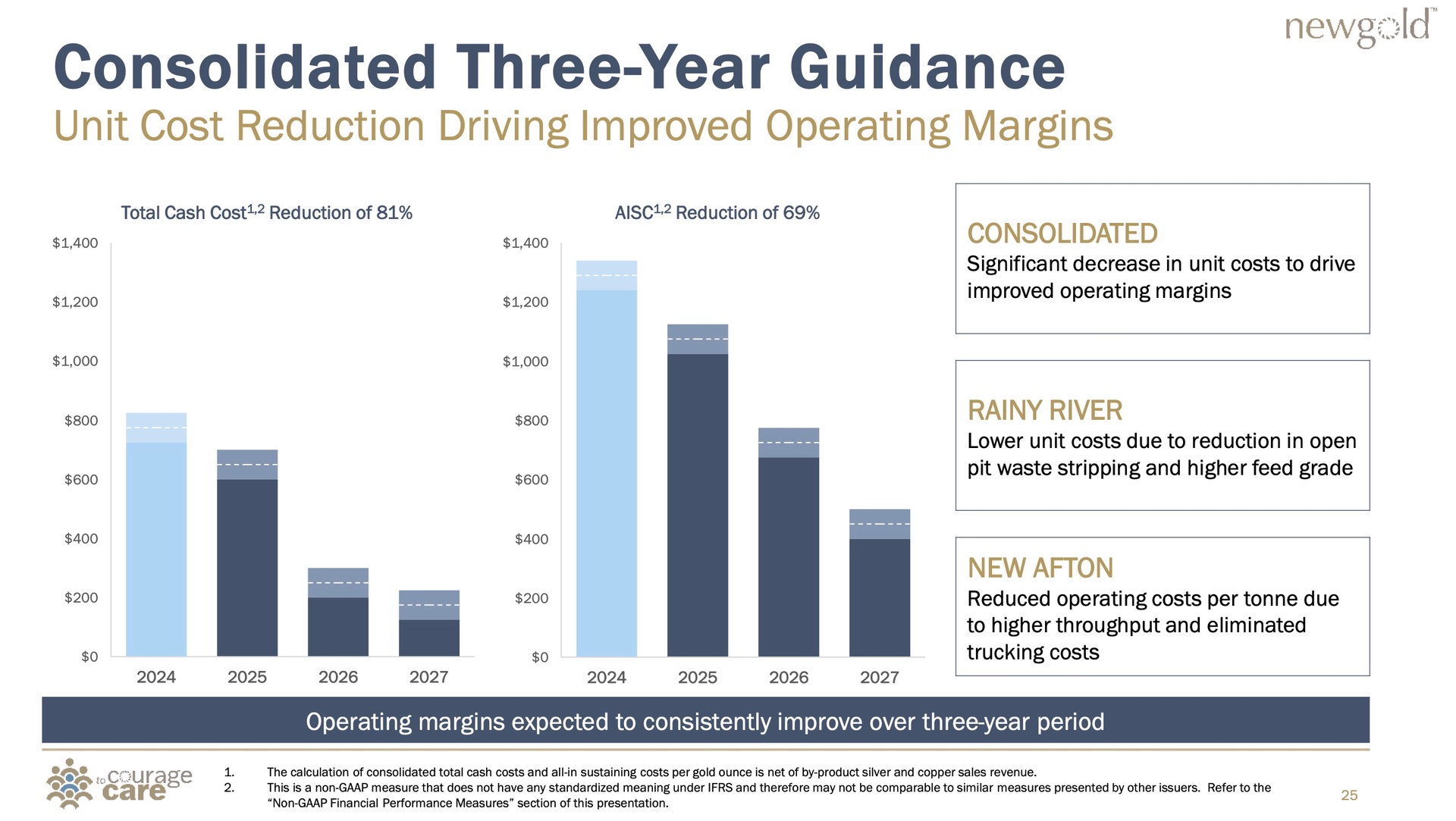 New Gold hat vor langer Zeit die Rainy River Mine teuer übernommen. Im Management saßen hauptsächlich Banker und keine Minenbauer oder Geologen. Das Unternehmen besitzt zwei Minen Rainy River und New Afton. Der langfristige Ausblick sieht ab 2026 eine Produktion von 600.000 Geos vor (Gold 80%, Kupfer 18%, Silber 2%).
