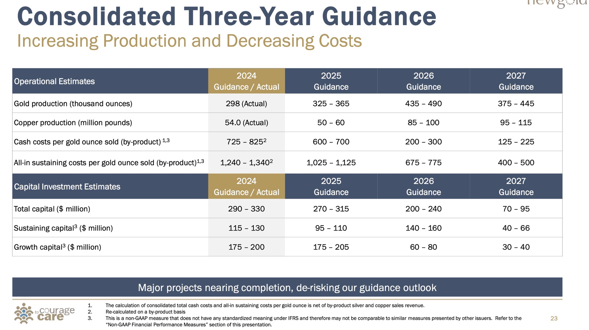New Gold Inc. („New Gold“ oder das „Unternehmen“) (TSX: NGD) (NYSE American: NGD) meldet die Ergebnisse des zweiten Quartals 2024 des Unternehmens. Die Produktion im zweiten Quartal 2024 belief sich wie geplant auf 68.598 Unzen Gold und 13,6 Millionen Pfund Kupfer, bei Betriebskosten von 1.156 $ pro verkaufter Goldunze (auf Basis von Nebenprodukten) 3 und All-in Sustaining Costs 1 von 1.381 $ pro verkaufter Goldunze (auf Basis von Nebenprodukten). Die planmäßige Durchführung des zweiten Quartals führte zu einem starken Cashflow aus dem Betrieb von 100 Millionen $ und einem freien Cashflow 1 von 20 Millionen $. Das Unternehmen erwirtschaftete in den ersten sechs Monaten des Jahres einen positiven freien Cashflow und ist nun in eine Phase eingetreten, in der ein nachhaltiger freier Cashflow generiert wird.