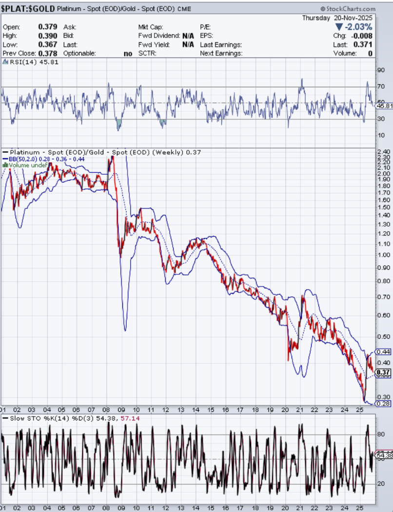 Ein nochmaliger Abwärtsspike in den Ratios Platin gegen wenigstens Eines der (halb-)monetären EM sieht zunehmend möglich aus. Bei Pt:Ag könnte es tatsächlich ein neues Tief geben, während bei Pt:Au schon das Erreichen des vorherigen Tiefs bei 1:3,4 ein relatives Extrem darstellen würde (50-Wochen Bollinger Band mit 2 Standandardabweichungen).