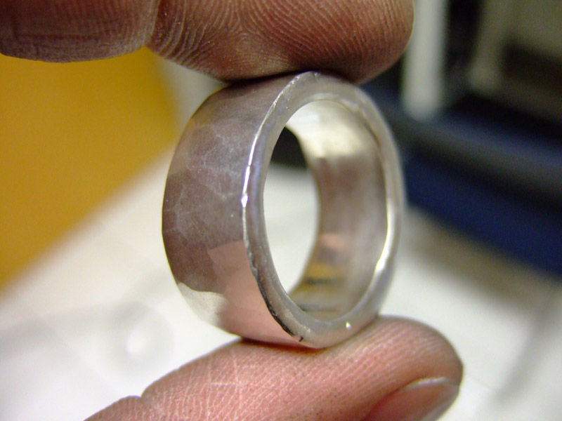 Das Silber wird während des Schmiedens immer weiter verdichtet und wird dadurch härter und spröder, man muss den Ring zwischendrinnen immer wieder nachglühen, damit das Silber wieder weich wird und keine Risse bekommt.