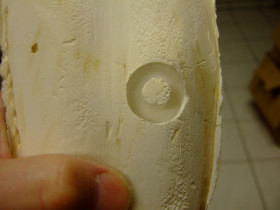 Zuerst wird mittels eines Plastikrohres mit dem richtigen Durchmesser eine grobe Form in eine Ossa Sepia Schale gedrückt, bzw vorsichtig gehämmert, dann wird diese Form mittels diversester Werzeuge, Kratzzeug und Fräsern so weit vergrößert, dass sie den Ansprüchen entspricht.