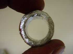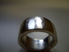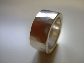 Das Silber wird während des Schmiedens immer weiter verdichtet und wird dadurch härter und spröder, man muss den Ring zwischendrinnen immer wieder nachglühen, damit das Silber wieder weich wird und keine Risse bekommt.