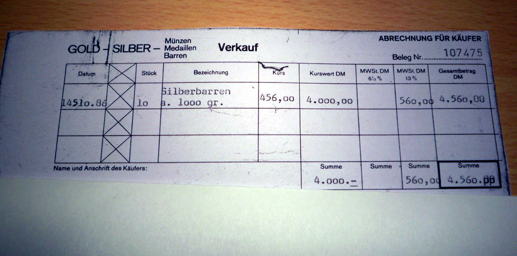 Mein 1. Kauf: Am 15.04.1986 2x 1000g Silberbarren für 880 DM + 14% MWST = 1003,20 DM ( Kurs fast wie vor einem Jahr