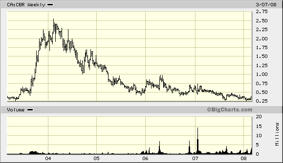 CBRs MC beträgt aktuell 33,6 Mio. CAD$ (96 Mio. ausstehende Aktien zum 31.12.07), man bekommt den Rest der Firma also günstig dazu Augenzwinkern .